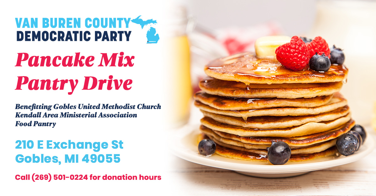 As the days grow shorter and colder, many families in our community turn to local food pantries for help. To make sure breakfast is never out of reach, the Van Buren County Democratic Party is partnering with the Gobles United Methodist Church–Kendall Area Ministerial Association Food Pantry to collect pancake and waffle mixes for families in need.