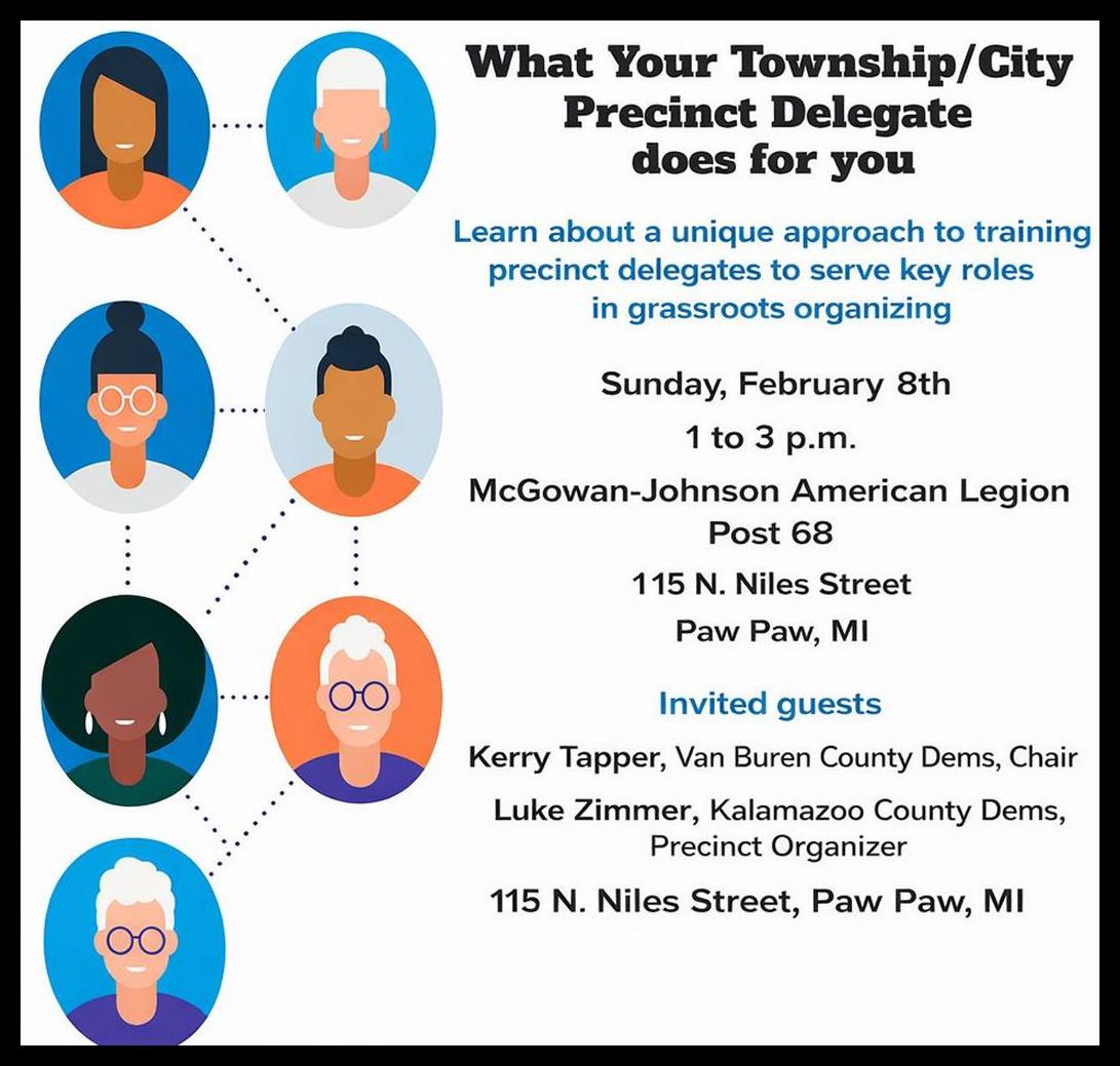 Mark your calendars for the Van Buren County Democratic Party’s February Monthly Meeting on Thursday, February 5. This is a great opportunity to stay informed, hear directly from Democratic candidates, and help shape the work ahead. Special Opportunity Before the Meeting: Suzanna Shkreli, Candidate for Secretary of State, will be available from 4:30 – 5:30 pm for informal conversation and connection prior to the meeting. Attend In Person: VBISD Conference Center 490 S. Paw Paw Street, Lawrence Thursday, February 5 • 5:00 – 8:00 pm 5:00 – 5:30 pm Arrival, dinner and a chance to mingle 5:30 pm Welcome 5:35...